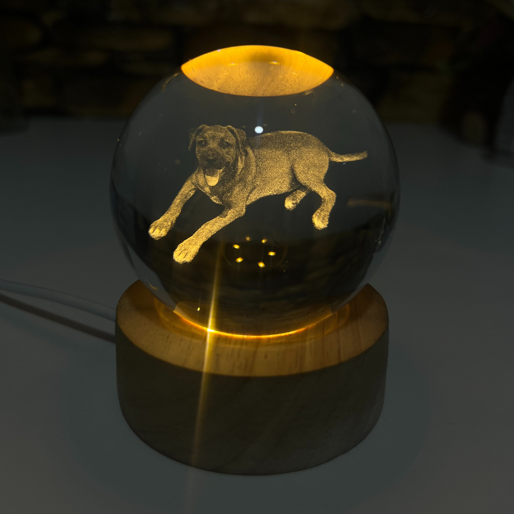 Sí, todas nuestras esferas vienen con su base de madera incluida. La base tiene luz LED, lo que permite que la imagen grabada se ilumine suavemente, creando un efecto mágico.
