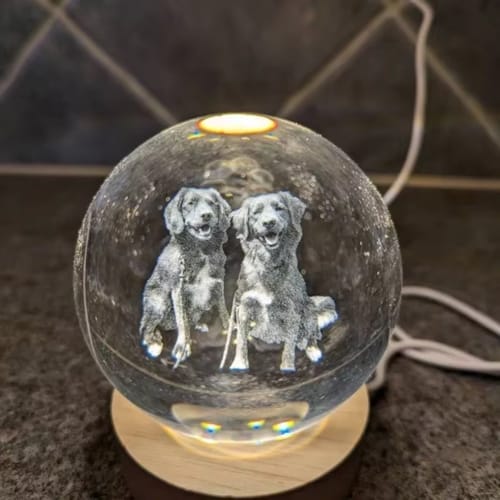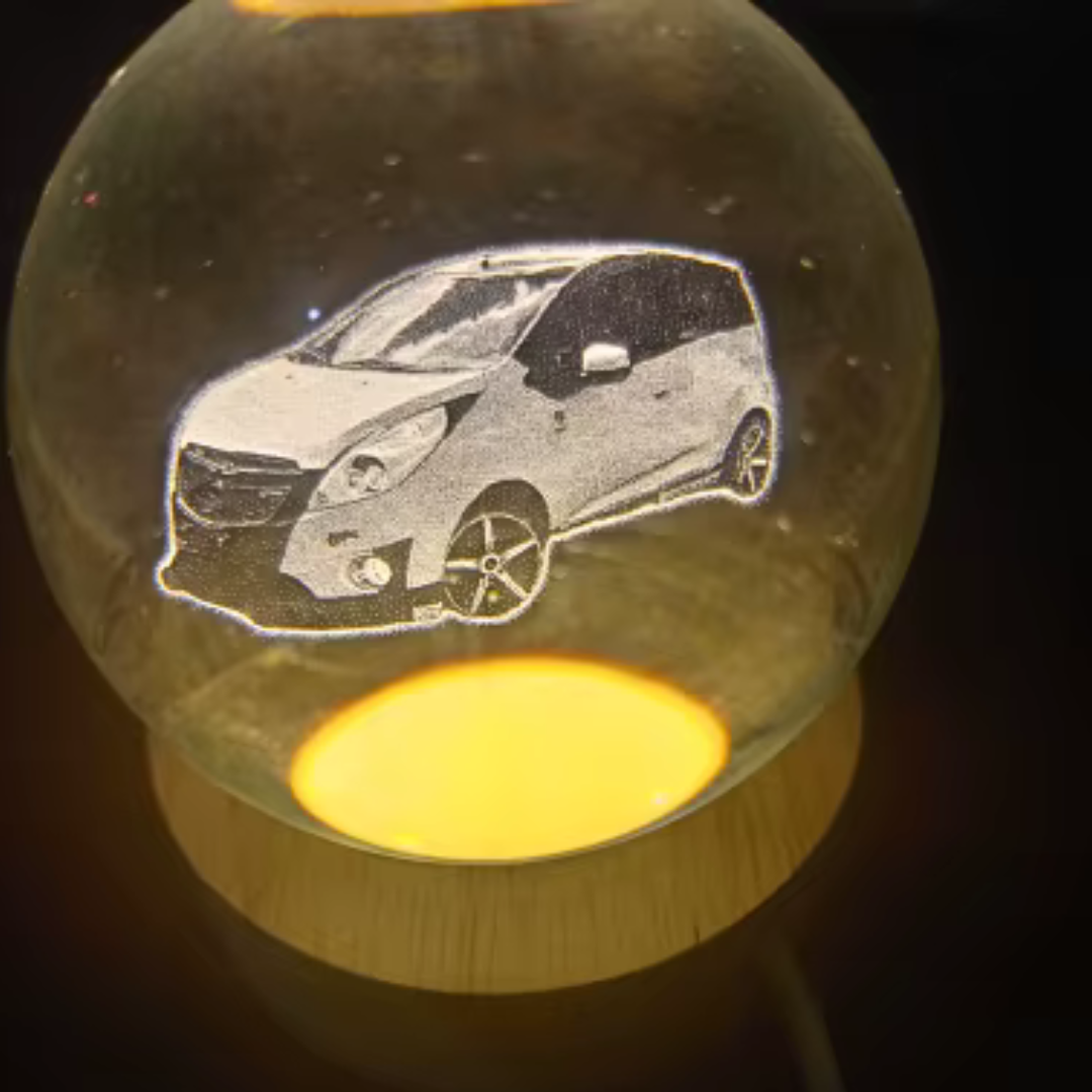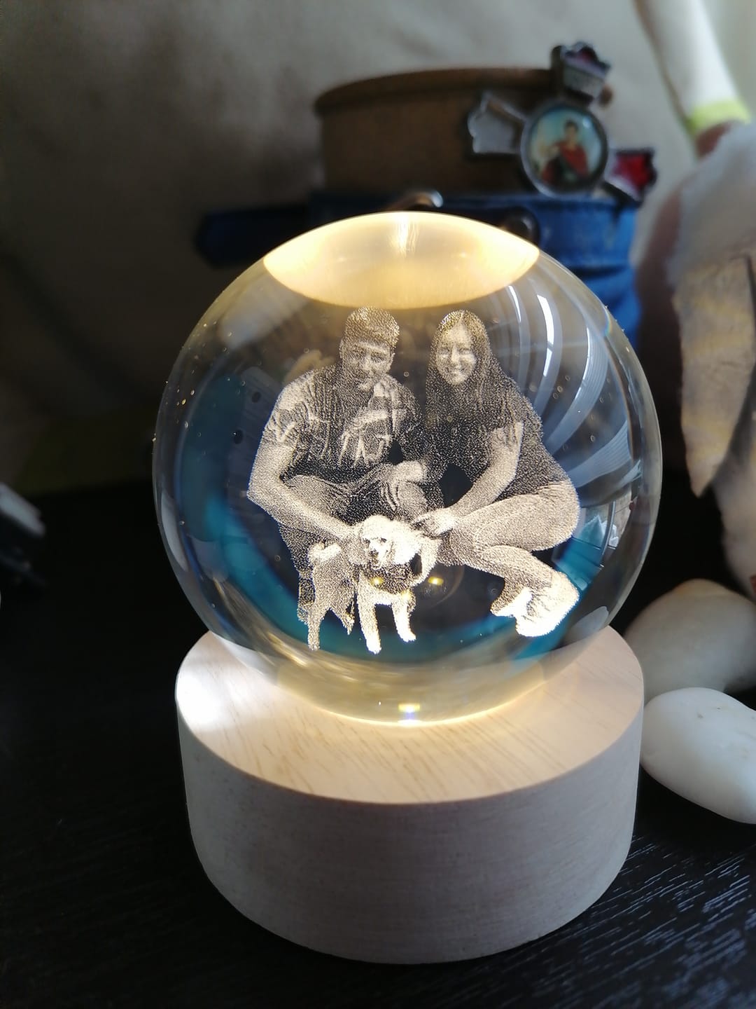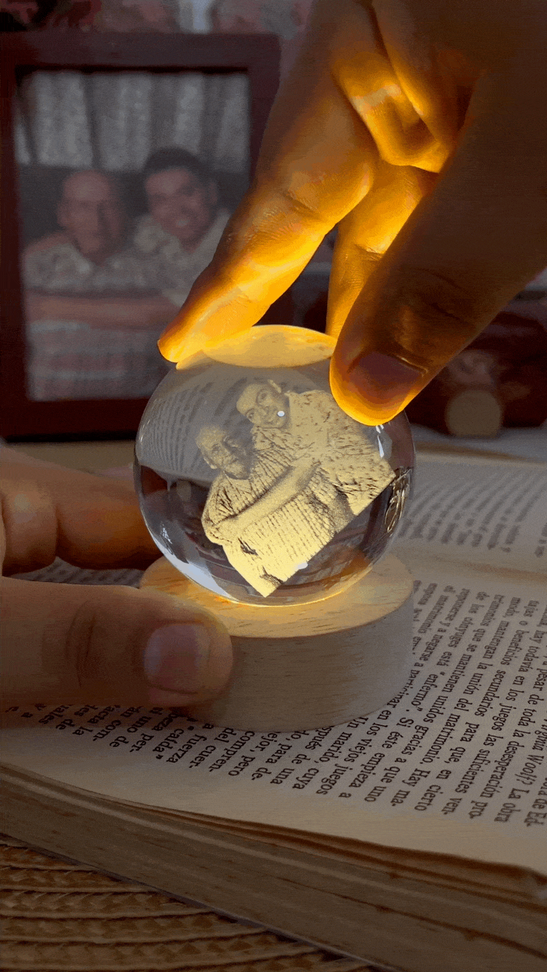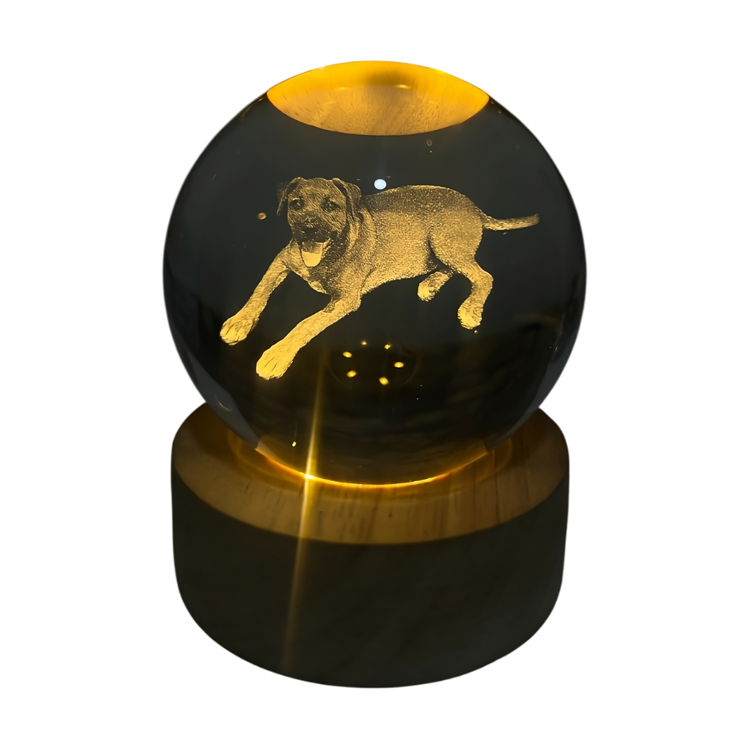Sí, todas nuestras esferas vienen con su base de madera incluida. La base tiene luz LED, lo que permite que la imagen grabada se ilumine suavemente, creando un efecto mágico.